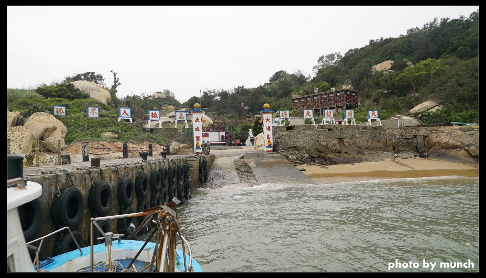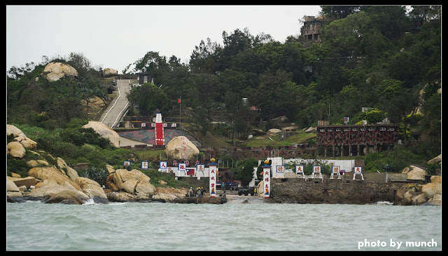 船靠近碼頭!碼頭如碉堡,登岸處是防守最嚴密的地方,一堵城牆,一個入口,已成前線島嶼的標準景觀。