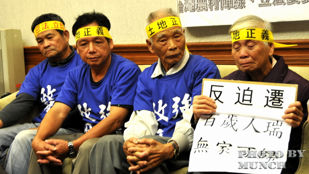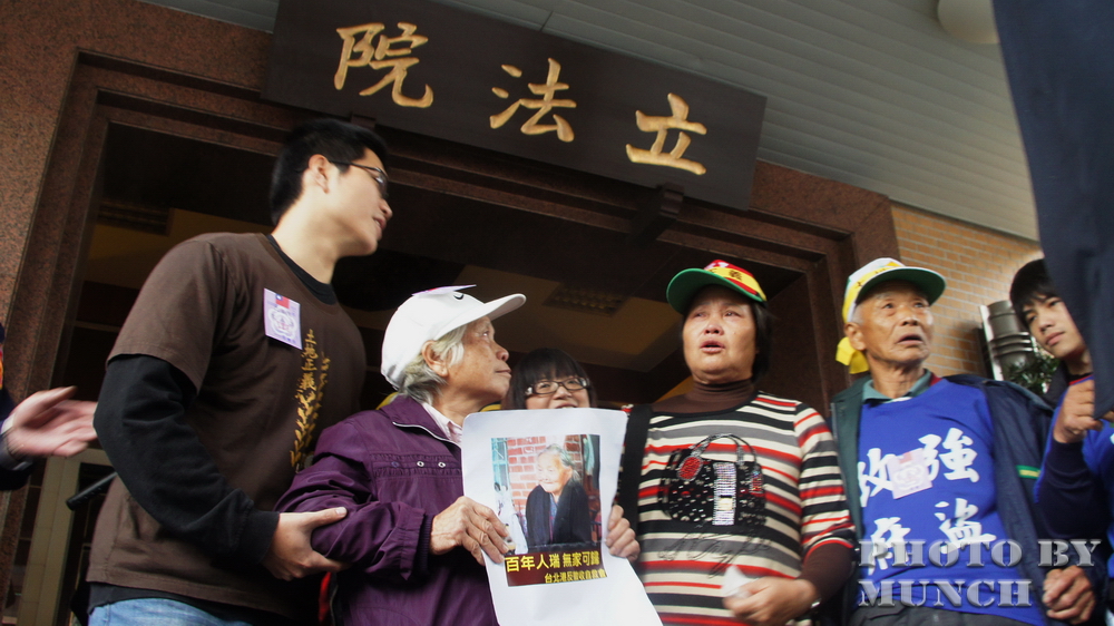 2012年1月,土徵法修法關頭,農民齊聚台北街頭,七十歲的汪菊,在立委林淑芬的安排下,進入立法院中庭,希望向王金平陳情,通過符合土地正義的民間版本,但是無人願見,王菊大哭,七十歲老人的淚,為貪婪國家、無情政府,註記建國百年的羞恥。