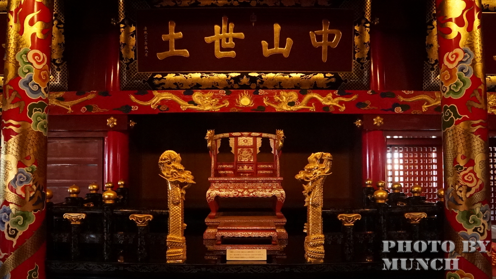 部分就只能尋找資料,重新臨摹複製,像是在正殿二樓大庫理,國王寶座後,象徵中國冊封認定,作為權力來源的清代皇帝賜匾,康熙所賜「中山世土」,雍正所賜「輯瑞球陽」,乾隆所賜「永祚瀛壖」,都已是重製。
