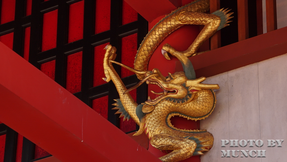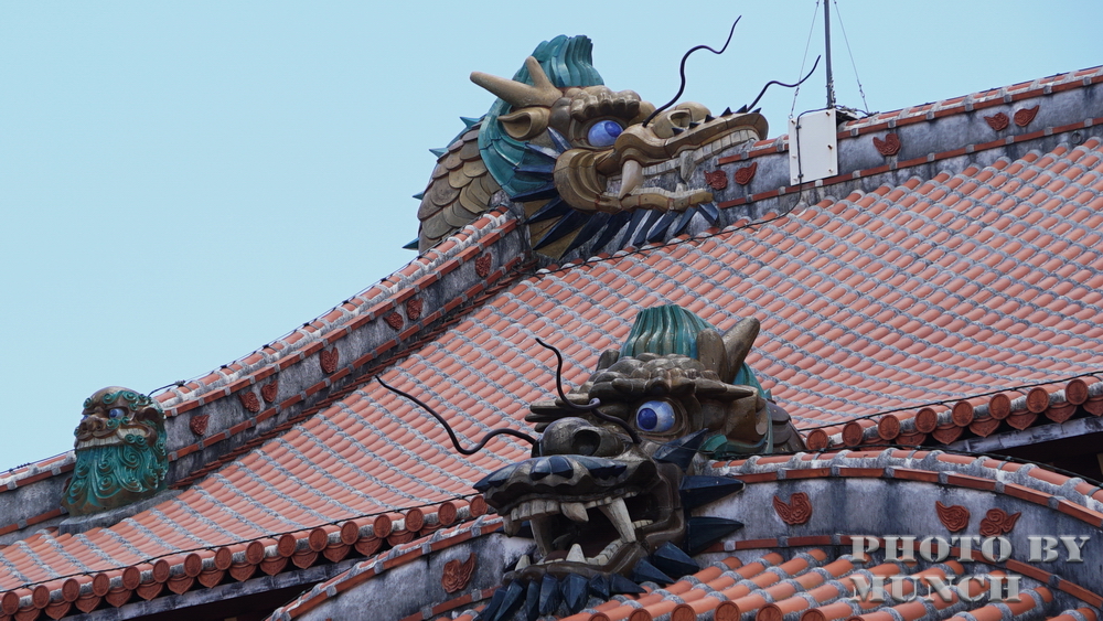 特別是正殿外的「龍」,其實應該說是「蟒」。注意看門面之上的「龍」,身形是「四爪」,算是「蟒」。因為只有中國皇帝可以用「五爪金龍」,琉球受冊封為王,當然不能用九五之尊的龍,只能用「四爪之蟒」。