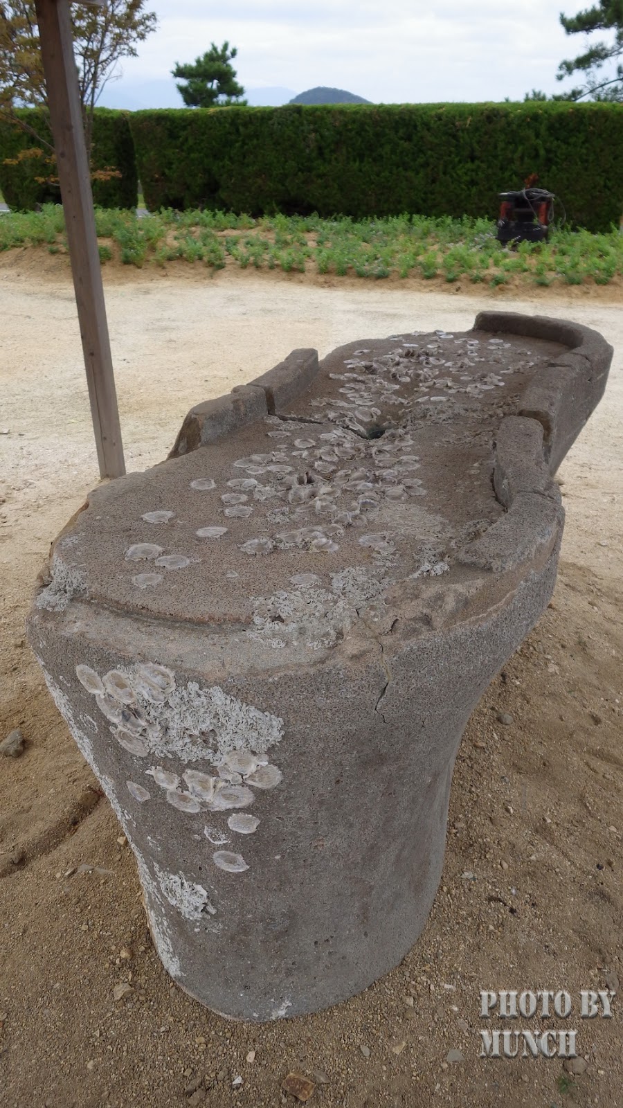 接著,前往歷史區域,導覽小姐帶我們到廣場區,觀看一座佈滿藤壺的石製解剖台。導覽小姐表示,解剖台早期被用來做解剖的醫學研究,以及截肢手術的醫療,上面會長滿藤壺,是因為在漢生人權平反之後,一些殘暴歷史的器物被丟棄,解剖台一度被棄置海邊,後來決定搬回來放置,讓後世人記得這段悲傷歷史,記取教訓。