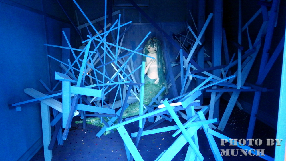 在島上,今年配合藝術季,邀請有藝術家田島征三佈展,他善長以漂流木創作,利用舊房舍設計漂流木製作的卡通主角,以及水族館,其中機械設計會掉下彈珠眼淚的人魚公主,女兒看了就說代表島上居民的悲傷心情。