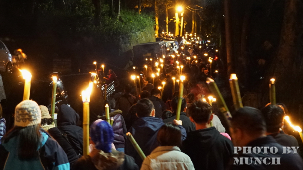 繞山一趟,大概一個多小時,坡度不陡,但是山路窄,需要注意拿火把的快樂小孩,保持適當距離,不小心就燒髮燒衣,還有被滴落的火油燙到。