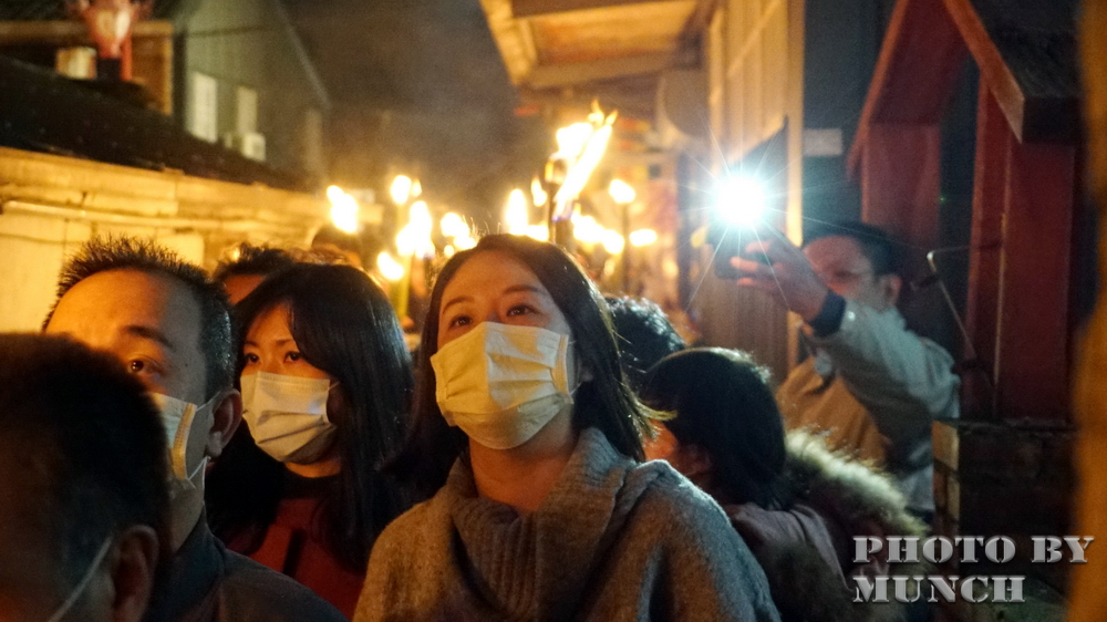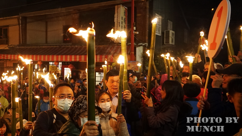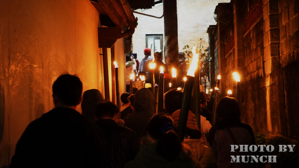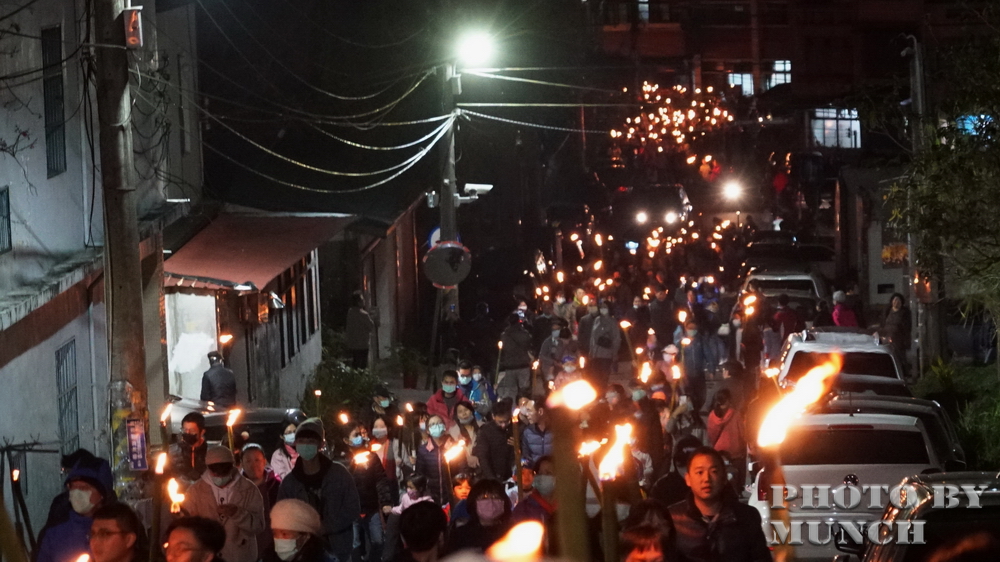大概6:30,北埔居民的遊行隊伍,舉著火把到遊客隊伍的後方。