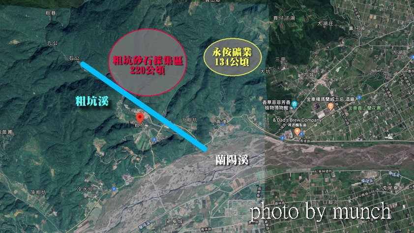 222公頃的粗坑砂石開採區,面積是永侒礦區的一倍大,位置大概在永侒礦區的西邊。甚至在地理景觀上,永侒礦區挖在山裡,在內城村可以看見剷掉的山頭,粗坑砂石開採區就是在中華村對面山坡,直接開挖。