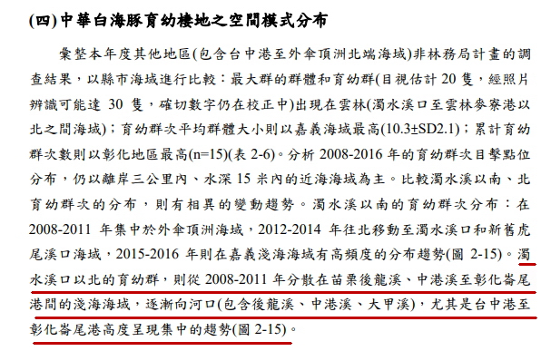 以瀕危保育的白海豚為例,根據白海豚學者長期生物監測,崙尾水道這片廣大潮間帶水域,已經證實是白海豚出沒熱區,甚至懷疑是幼豚的生養棲息地。在2016年行政院農業委員會林務局委託的《中華白海豚族群生態與食餌棲地監測》研究計畫,清楚敘述崙尾港間的淺灘海域的白海豚育幼群呈現高度集中趨勢(紅線文字處)。