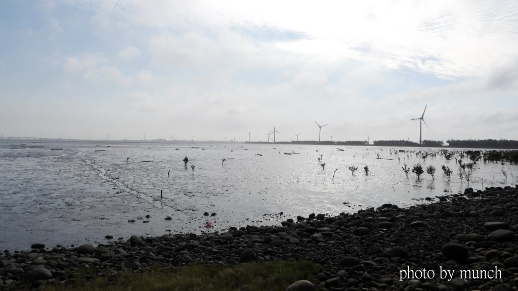 沒想到正逢大退潮時刻,就見一大片光電板就直接壓在潮間帶上。