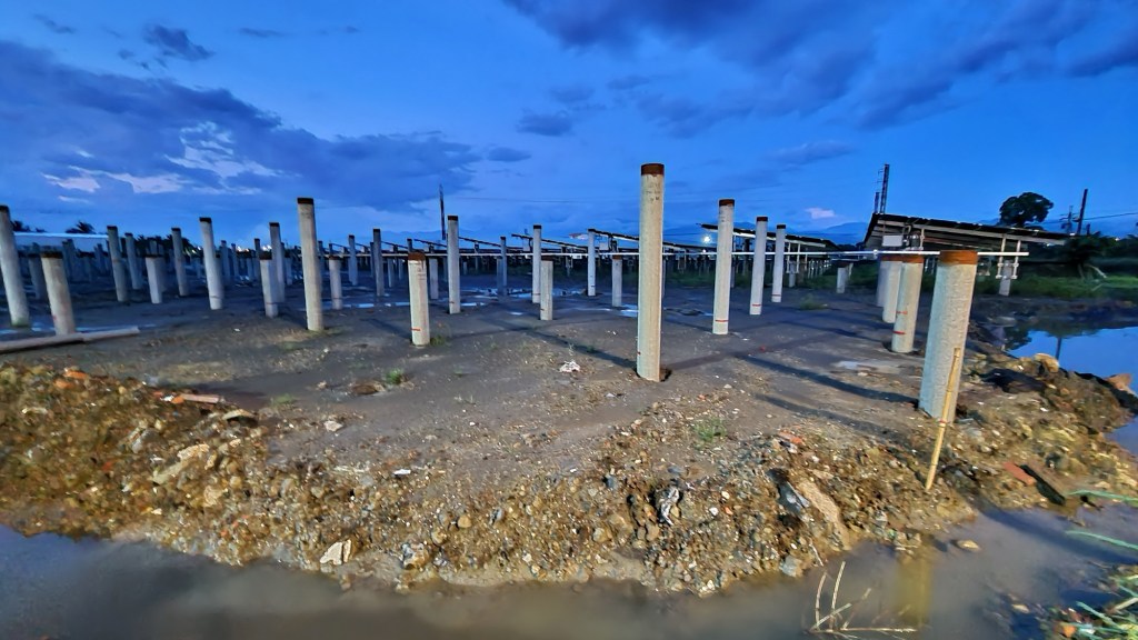 光電場需要土地面積,不斷開發農漁用地,為了保持農地農用原則,政府喊出農電共生或漁電共生的口號,讓光電與農漁業共存。但是在屏東東港一處魚塭,原本應該上面種電,下方保水的農漁共生,卻是直接填掉種光電,填土還是參雜磚石的建築廢棄土。這樣的填塭種電,魚要養在那裡?