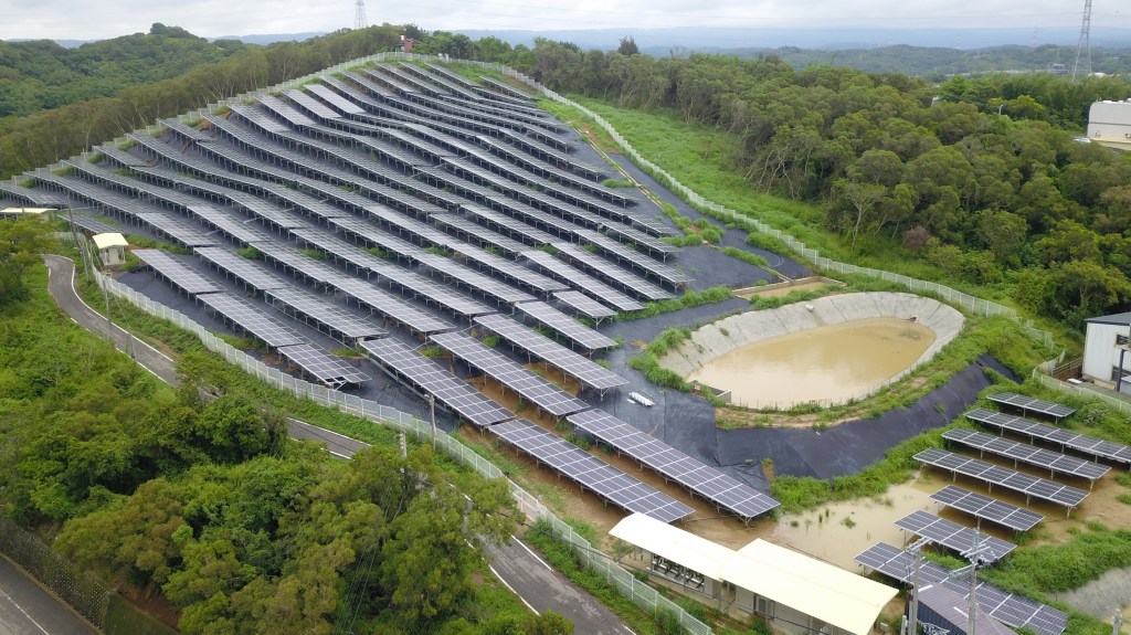 光電板上山下海找地裝設,在彰化一處廢棄物掩埋場,快速的填覆表面,上方鋪設光電場,形成相當粗陋的光景。