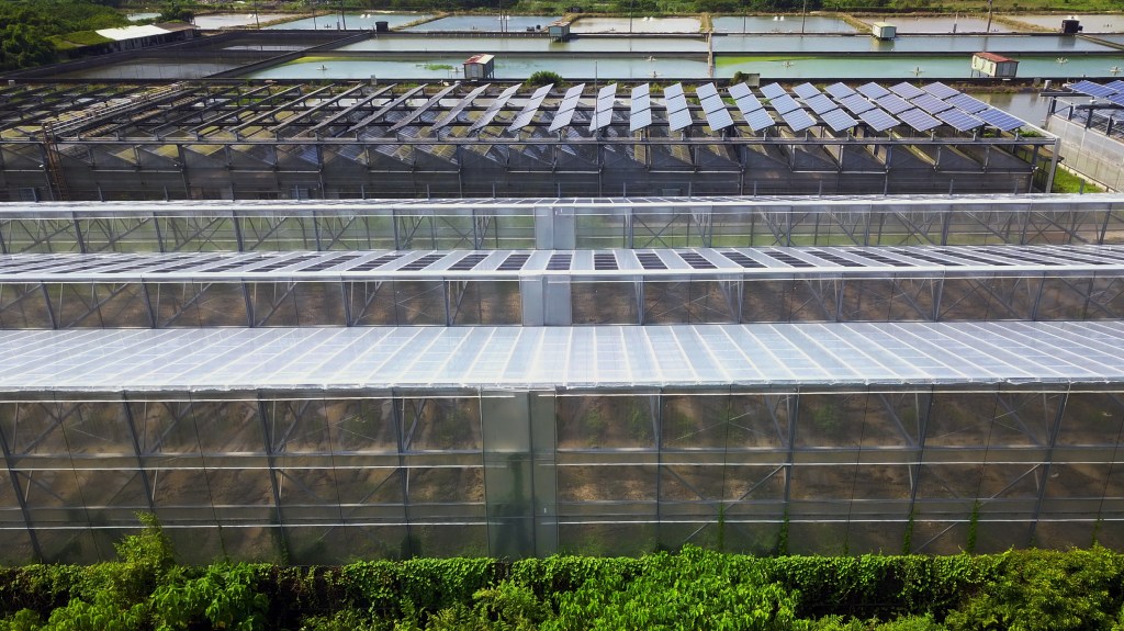 在屏東竹田農地,一處農場示範光電與農業共生的可能。利用不同光電板的裝設方式,以及棚舍式光電,實驗種植多種作物。
