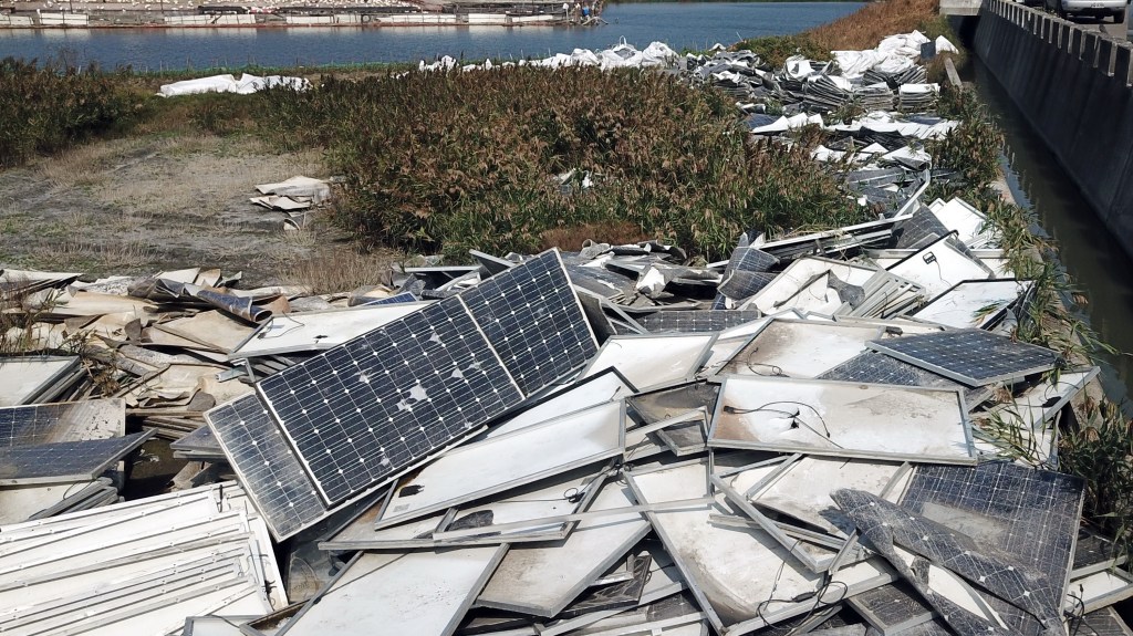 光電板蓬勃發展,但是在使用壽命之後,大量廢棄光電板,如何回收與處理,一直是惱人問題。在嘉義東石一處魚塭旁,發現一堆因為颱風破壞,遭到拆除棄置的光電板,讓人更加憂慮廢棄光電板的問題。