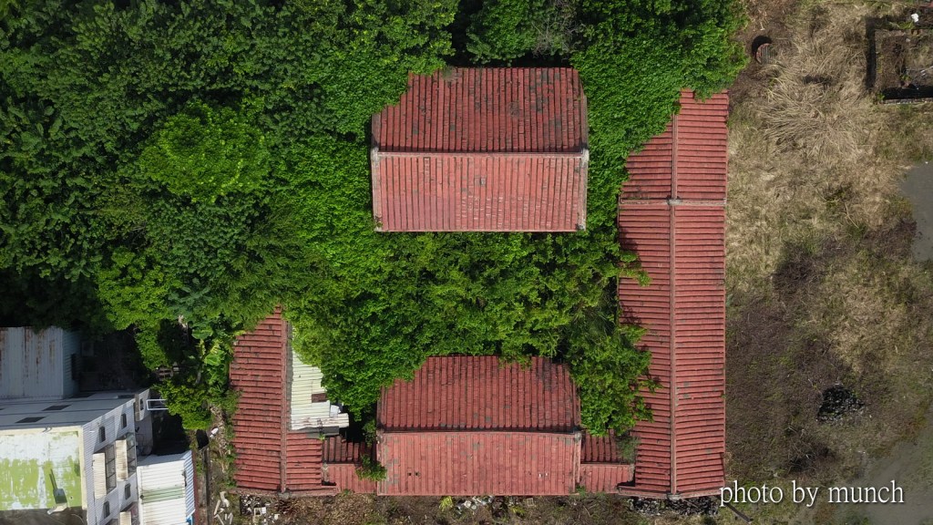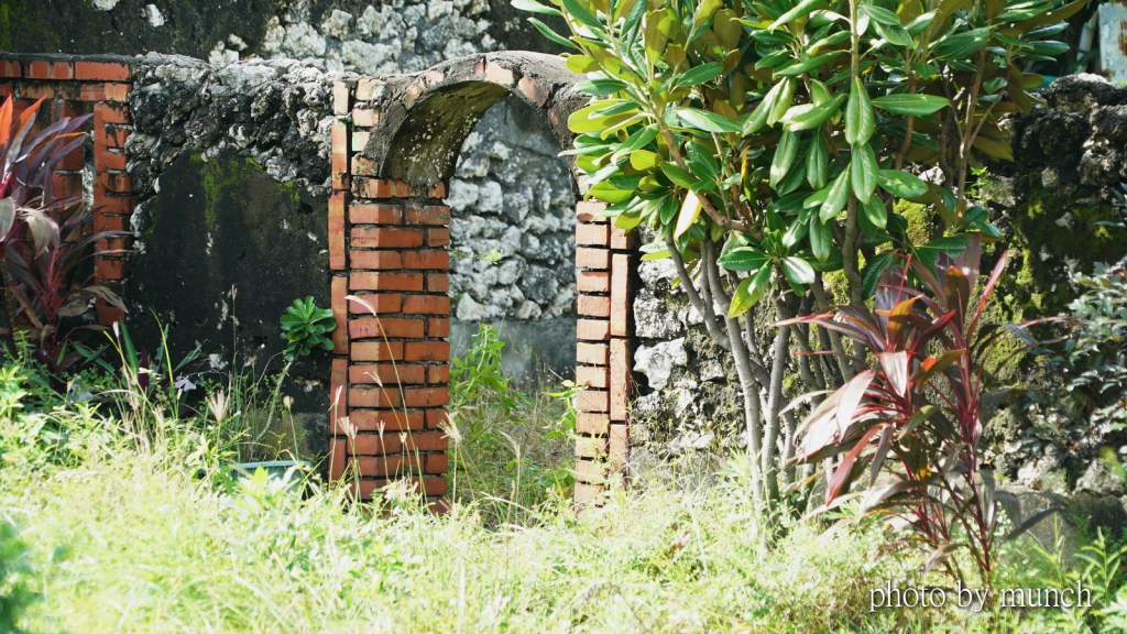 塌毁的牆面上,露出泥磚、咾咕石、石磚等建材,呈現多樣的色澤。