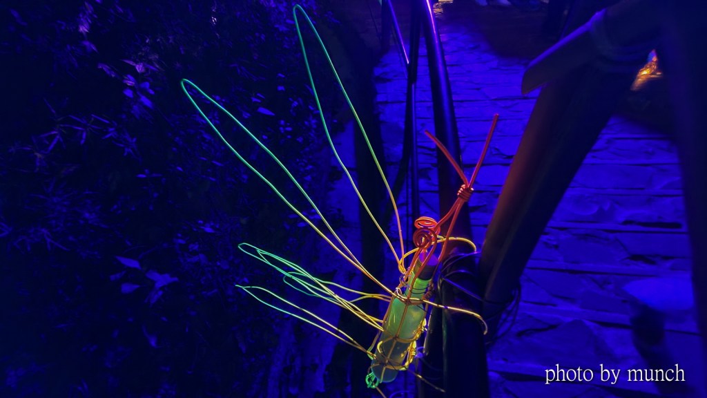 以鐵線彎繞,透過螢光反射所形成的光蟲,偏布整個展場,成為耀眼的夜間生物。