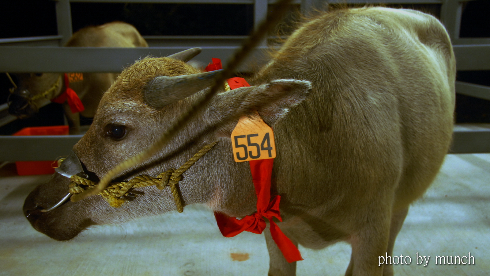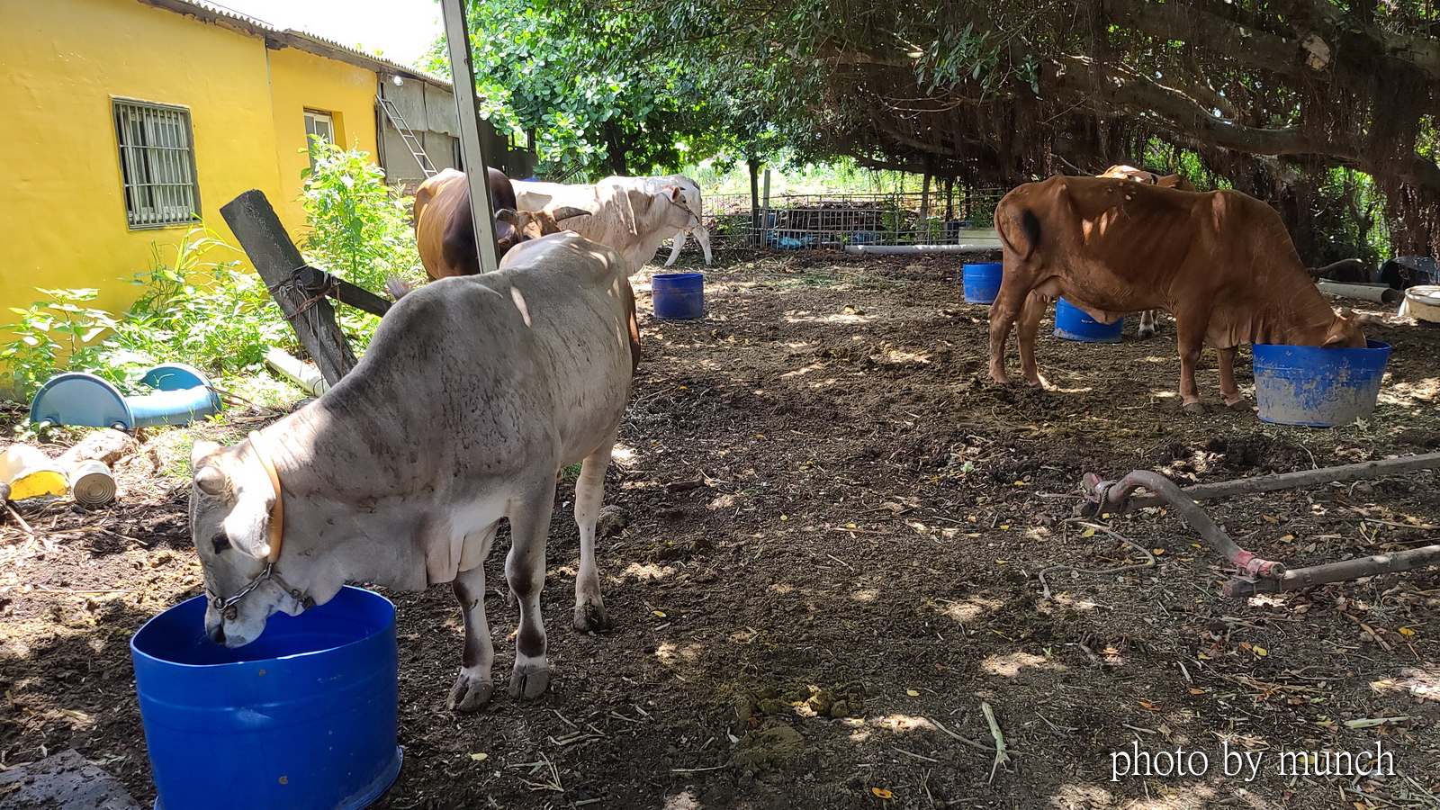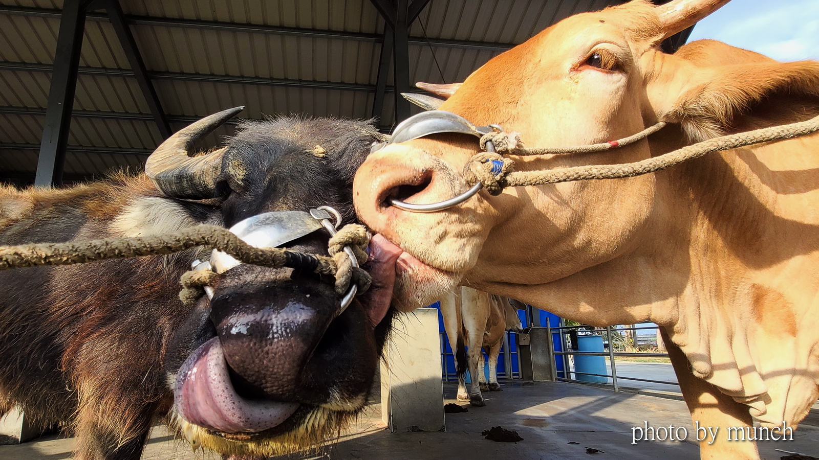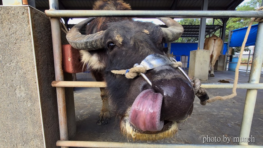 在老牛群中,李先生說一頭黃牛和水牛交情最好!(忘了名字)牠們牛種不同,年齡不同,先後到這裡,互看順牛眼,所以結成莫逆之交,平常要綁靠一起,繩子要留長一點,方便牠們互舔,不然就看到拉歪牛鼻,也要靠近對方的深深愛意。
