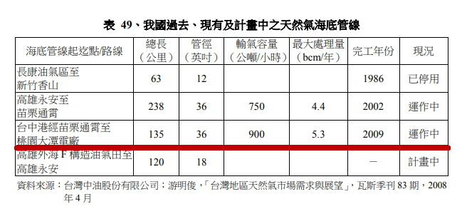 其實大潭電廠2009年已建一條36吋輸氣海管,從台中港輸氣而來,並且已經運作多年。如果依照當初建管最高輸送量每小時900公噸/小時,一年輸氣高達788萬噸天然氣(900噸*24時*365天),遠遠超過政府宣稱2025年大潭電廠全部機組所需要的600萬噸天然氣。