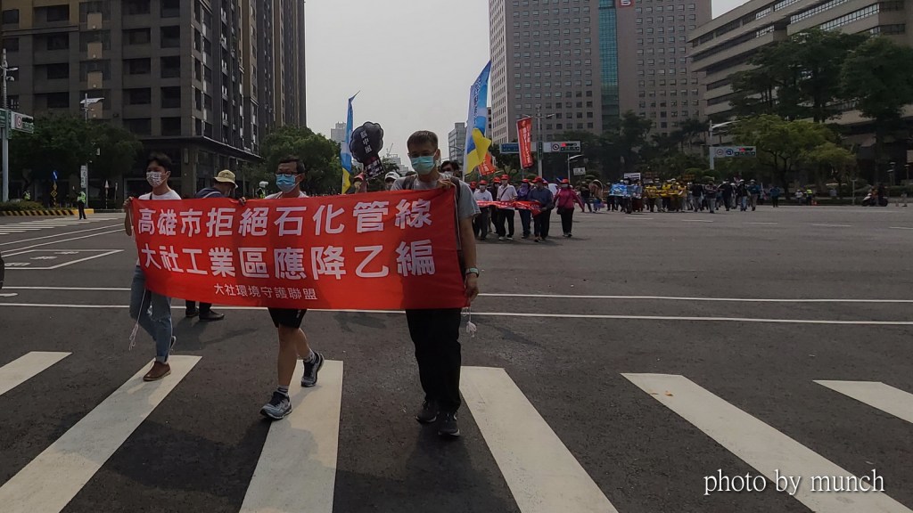 南部反空污大遊行提出六大訴求,一、興達停機除役,二、中鋼減少一座高爐,三、大社工業區降編,四空污應變門檻降低,五、校園裝空氣清新機,六、林園石化廠強制檢漏等。