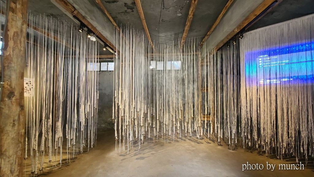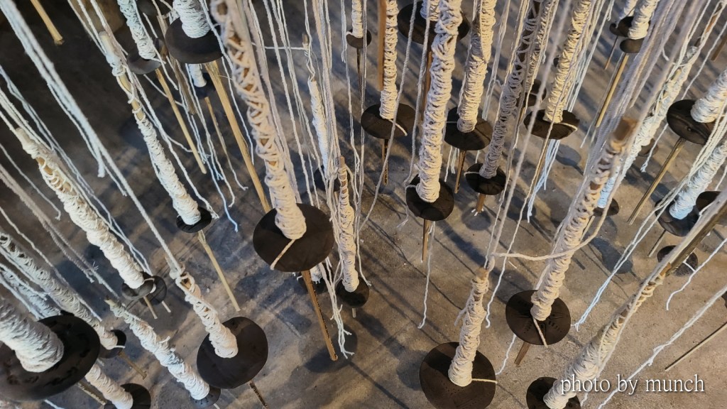 透過再製部落出土的紡錘,結合紡織棉線,懸掛在舊日糧食倉庫裡,形成一種回憶。