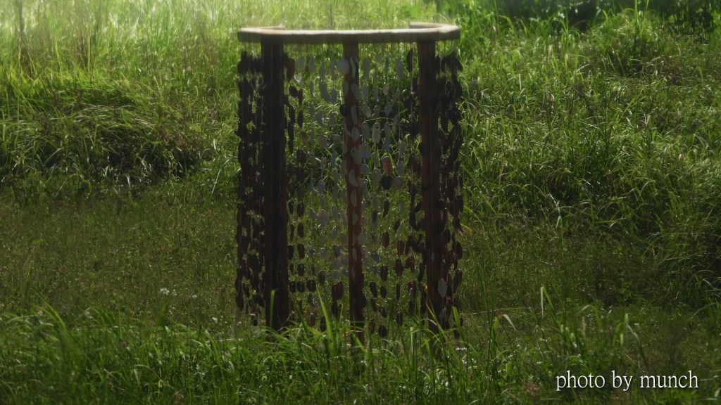 以部落傳統的田(野)燒,製作葉狀陶片,在港口部落梯田上,發出悅耳聲音。