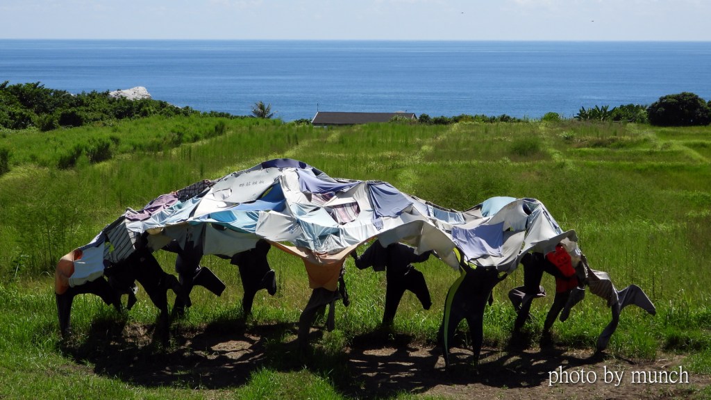 利用部落族人的舊衣,好野人的萬用衣,製作一個天幕,人形在田野上自在的跳舞。