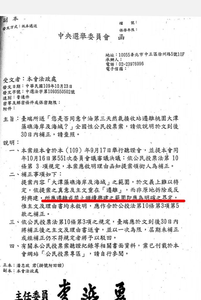 因為中選會要求補正明訂範圍,公投主文才以「藻礁生態系」觀點,增加五公里範圍文字,在理由書內並未提及藻礁有五公里。