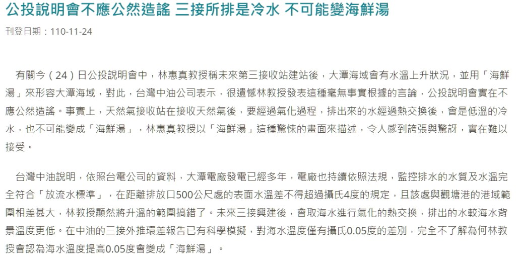 中油卻回答成,三接接收冷凝液化天然氣,排出是冷水,根本答非所問,誤導社會。甚至在下文才說明,「排放口500m溫差不得超過四度」,不就是承認林惠真教授所言升溫3.5度的真實性。