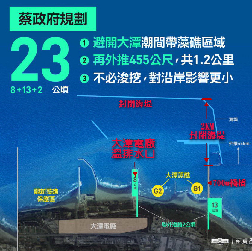 再外推案一直宣稱海域流通,但是實際看海堤設置,整個倒L型的海堤,東西向是封閉長海堤,擋住浪潮。南北向海堤長約3公里多,其中2公里多,也是封閉海堤,所謂流通水域的棧橋長度,僅約700多公尺。