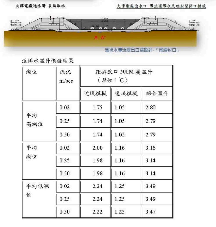 大潭電廠的溫排水口造成海域升溫,不是空穴來風,而是有模擬數據(見上圖),依照潮位高低,有著不同溫差,低潮時500m升溫達3.47度。