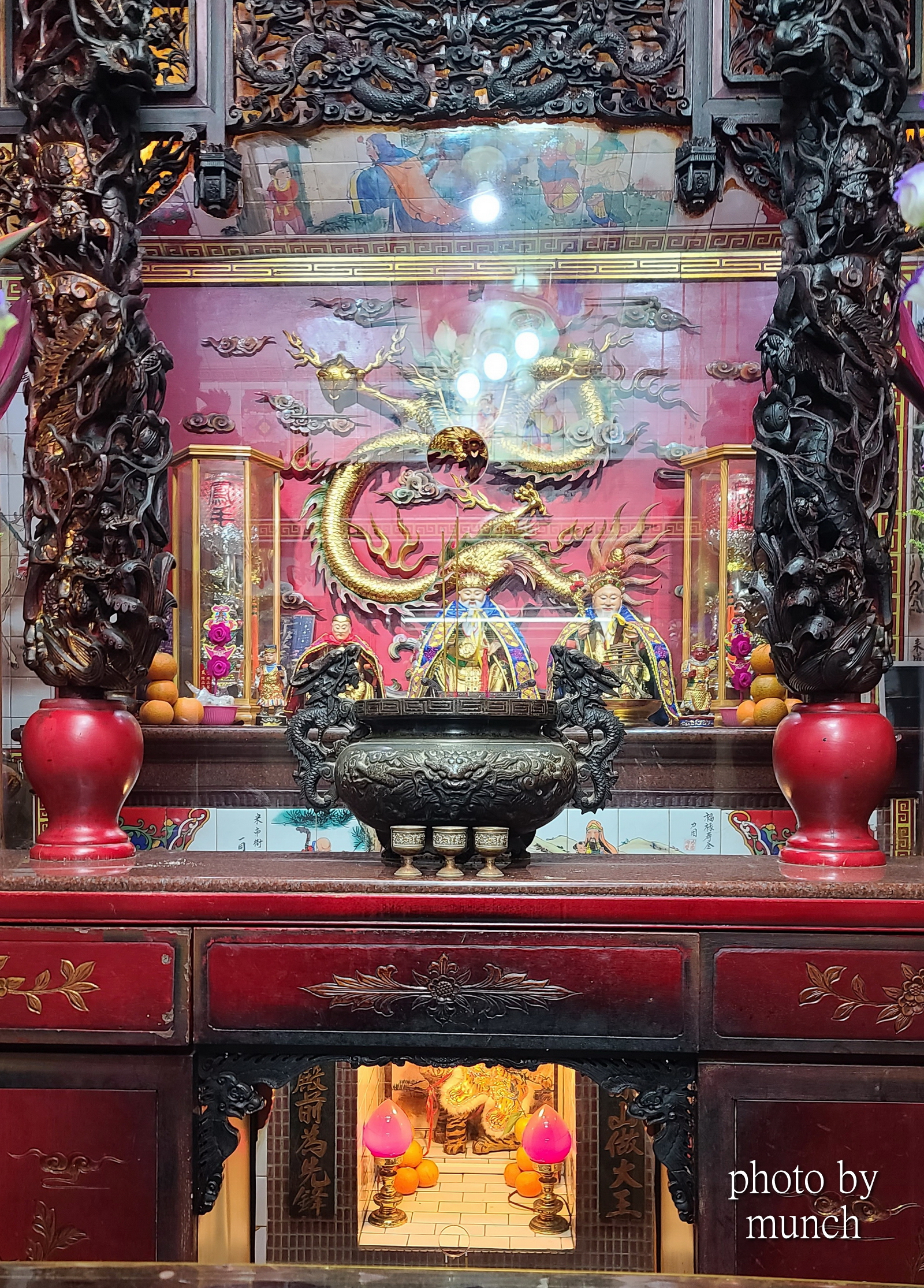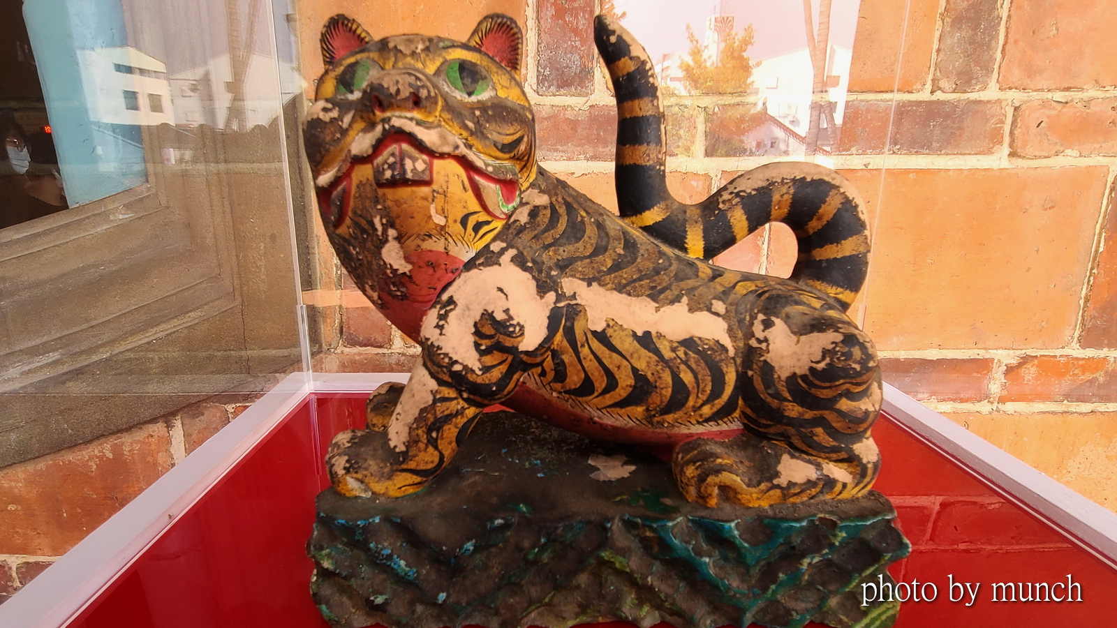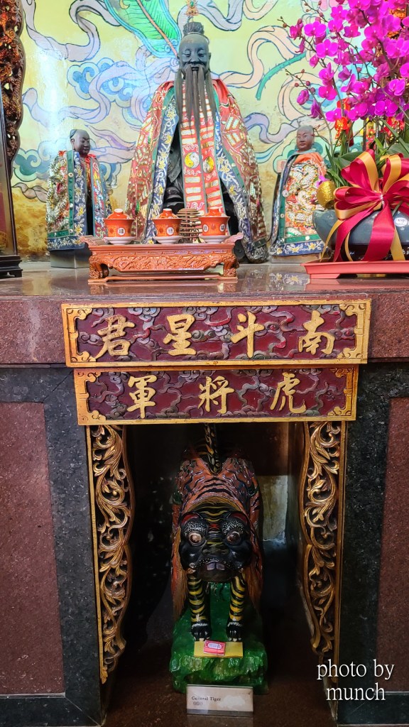 台南祀典興濟宮的虎爺,供奉在保生大帝壇前,形態非常福氣,特別信徒是不只供奉雞蛋,特別還有炸雞,旁邊那一桶就是十份討喜。