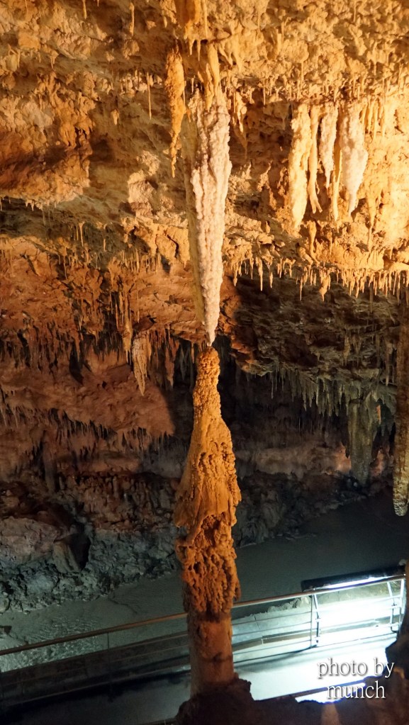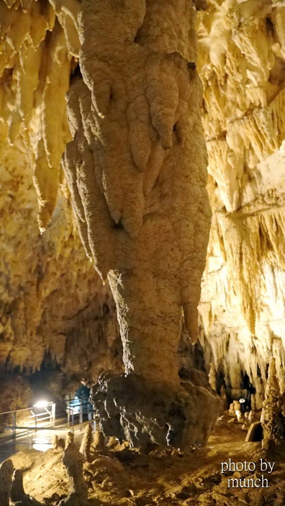 鐘乳石滴落,與地面堆積的石筍,漸漸連接形成石柱。