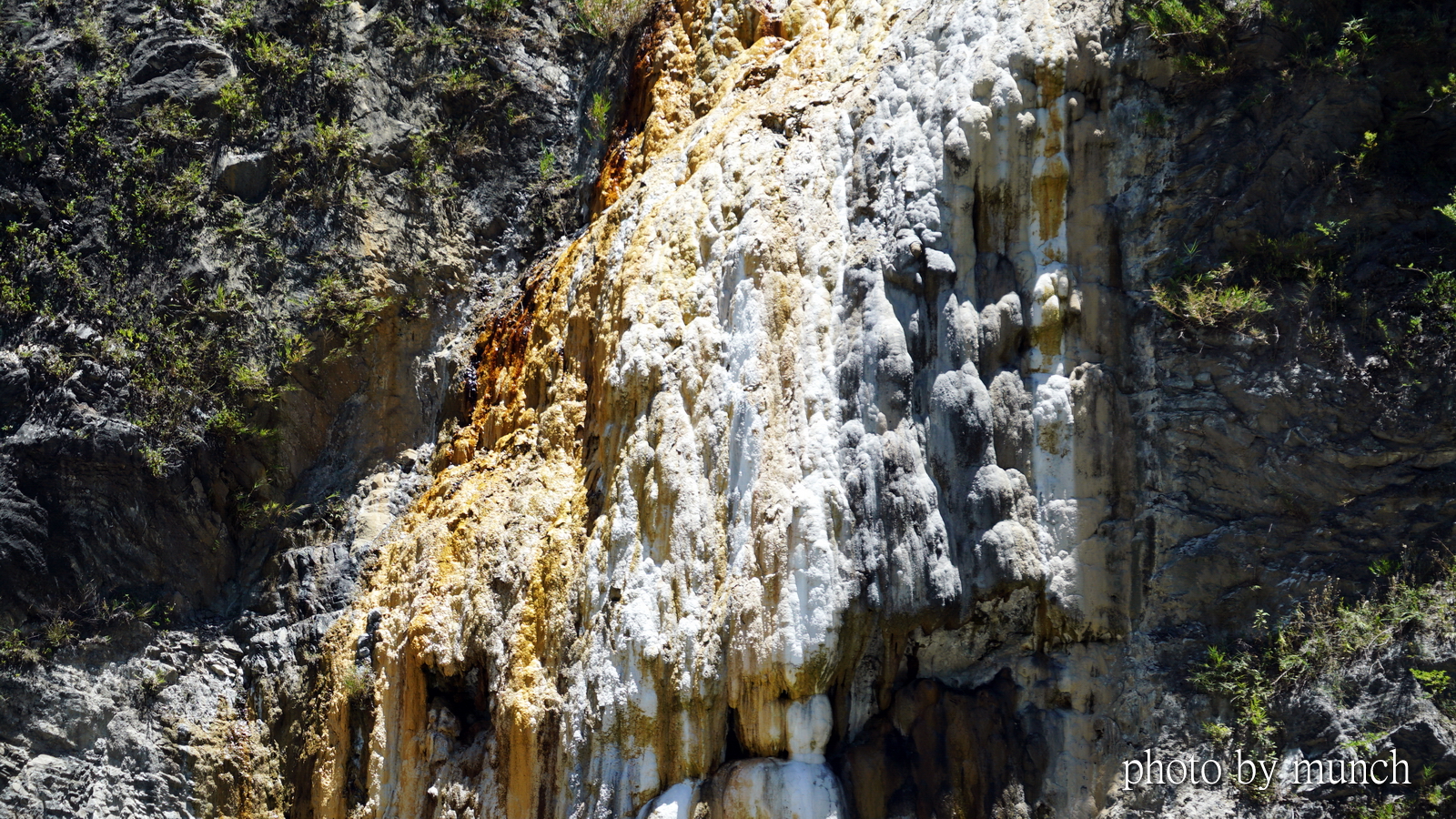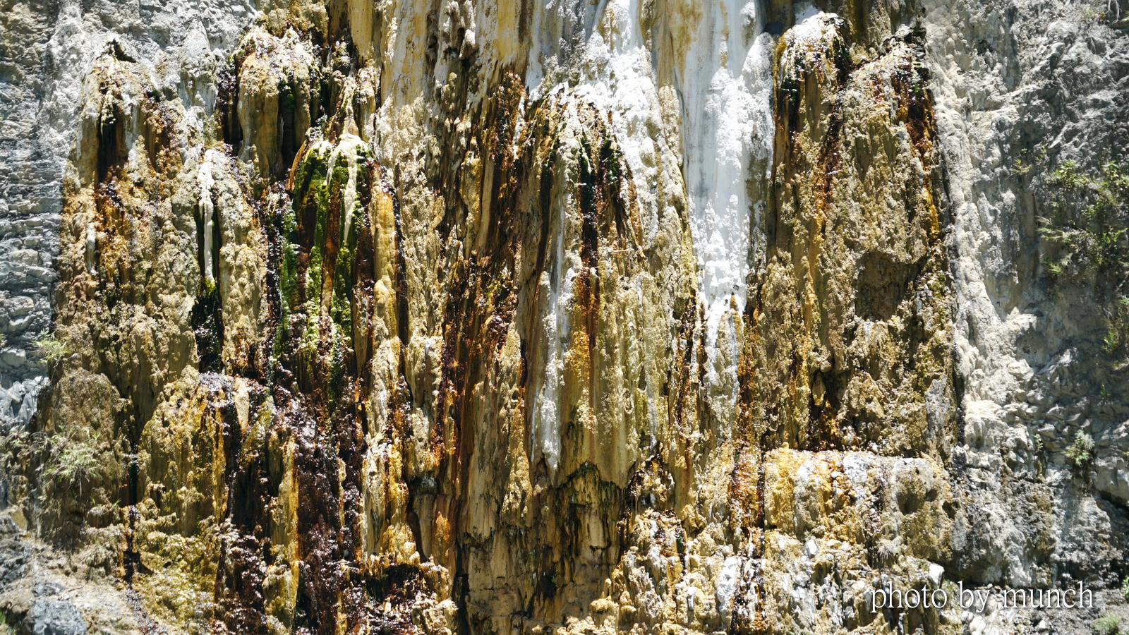 特別是谷壁上溫泉露頭,流出溫泉水冷卻後,形成的石灰華沉澱,遺留不同礦物質,所形成的瑰麗色彩,更是讓人驚艷的大自然壁畫。