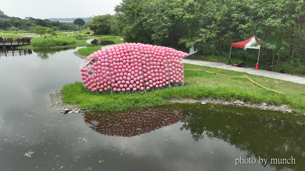 粉紅泡泡意象來自福壽螺卵塊,但是藝術家羅元鴻給予變形,像是動畫的王蟲,或是加上尾巴像是鯨魚,形態在觀者心中浮現。