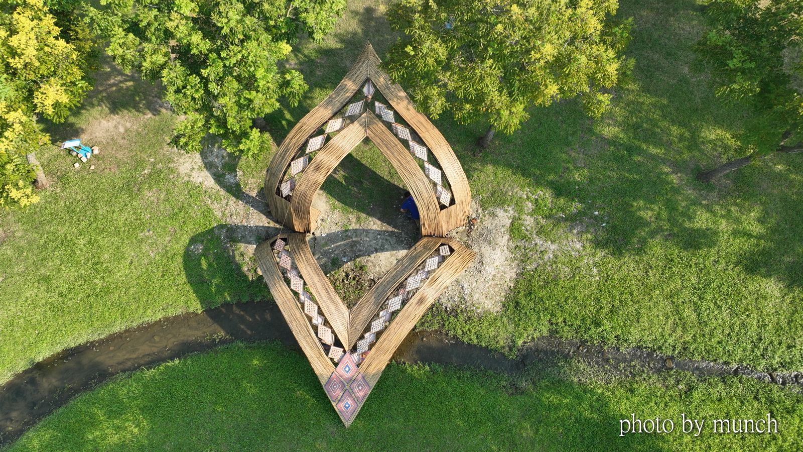 作品以木竹排列,形成巨大的雲紋,在大漢溪旁有著雲水相連的意象。