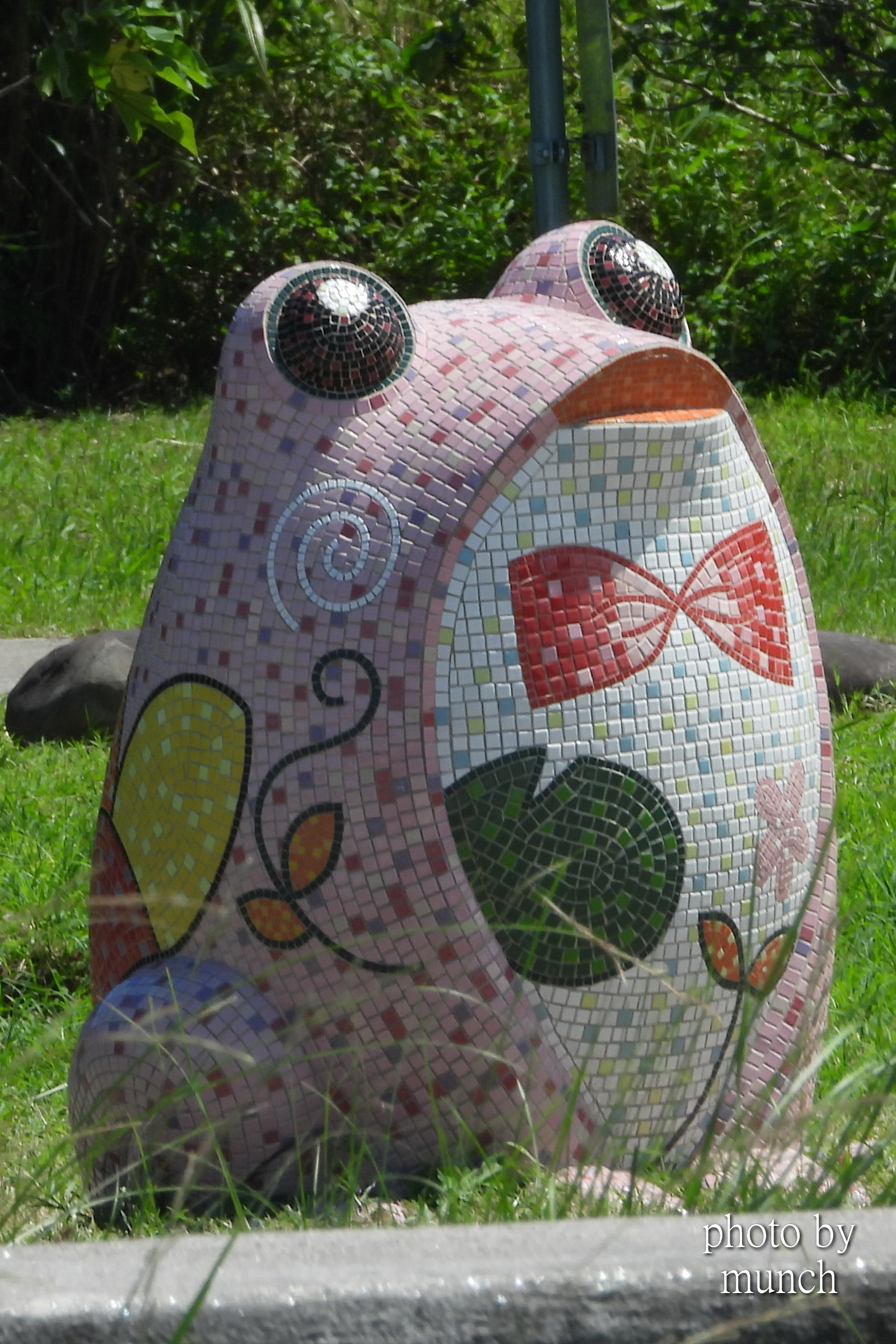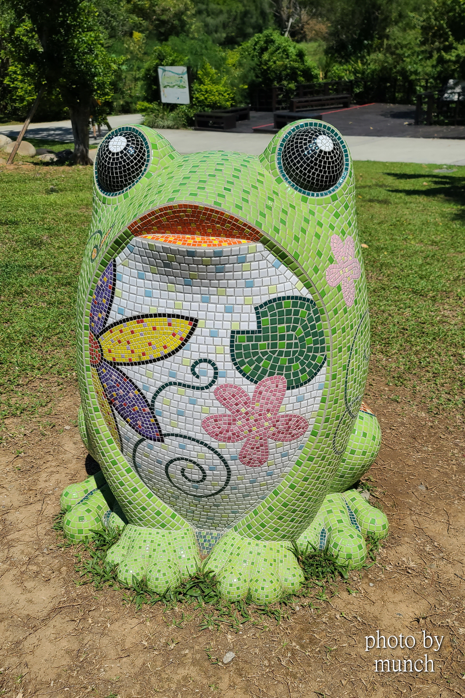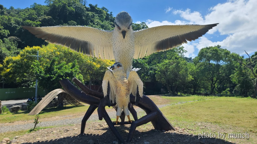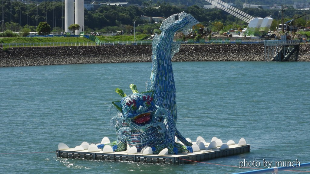 這件作品相當吸睛,原本以為是大漢溪的什麼神秘傳說,看完解說牌,才知道藝術家以五色鳥、樹蛙、蝙蝠、溪哥魚等在地物種,各取意象合成這隻討喜神獸,古代懸魚的造型,增加很多傳說想像。
