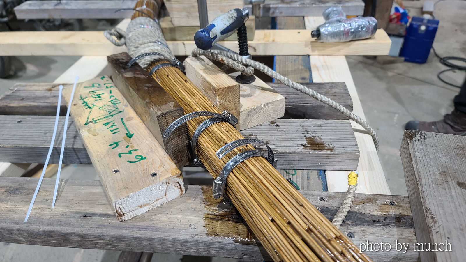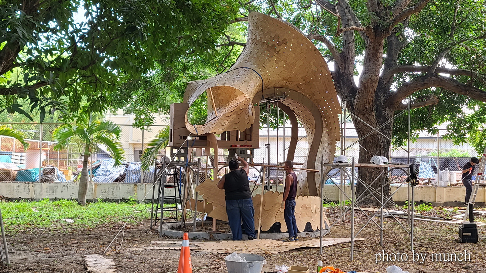 然後以大量竹管相接,並且彎曲,外部貼上木片,製造出有如鳥羽的二翼,正面看卻像合掌祈禱的雙手,非常具有藝術風格。