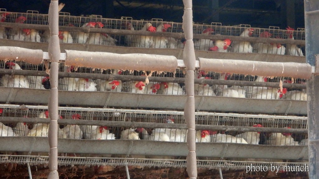 這是台灣平價蛋的生產工廠,俗稱格子雞,一格養一隻,雞頭吃飼料,屁股生雞蛋,幾乎囚禁式的空間,轉身都是奢望,生到不能生,抓去熬雞精,幾乎沒有動物福利可言。