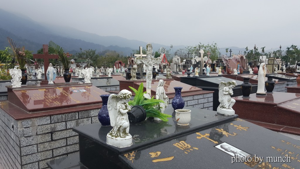 屏東萬巒萬金教堂後的天主教墓區,墳墓上豎立聖母與天使的庇護,創造特有墓葬藝術。