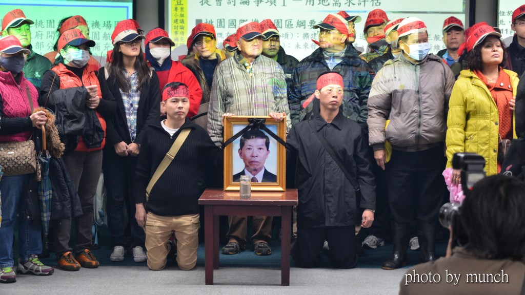 面對政府只想走完程序,不顧居民訴求,自救會決定癱瘓徵收審議大會,不讓徵收案通過,突顯程序粗暴問題。自救會居民在審查會場設立靈堂,桃園航空城反迫遷聯盟成員田奇峰持香,要求當時主席蕭家淇上香祭拜,發誓公正主持會議。主席拒絕,宣布停止開會,留下佔領會議室的居民。
