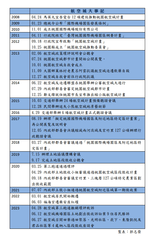 從機場建跑道,一路擴大徵收,變成空港自貿區,甚至成為整個區域的新城鎮重建,興起土地炒作,撕裂地方情感,桃園航空城計畫像是端著一個開發的核心,一路狂飆,吹噓造夢。