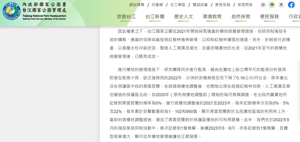 特別是台江國家公園,網頁上宣傳多年來,一直推動移除紅樹林,恢復黑琵等自然棲地,現今卻又反過來大量種植紅樹林,真是政策雙標矛盾。