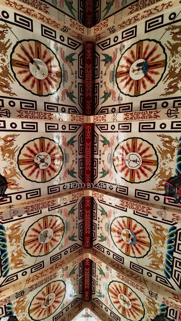 進入祭天殿後,立即就是讓人眼睛一亮的屋頂彩繪,完全是西方教堂的裝飾樣式,但是細細查看,卻是充滿台灣廟宇的元素。
